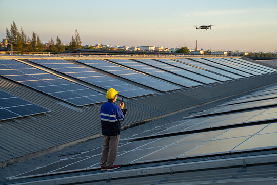 Specialist technician professional engineer with laptop and tablet maintenance checking installing solar roof panel on the factory rooftop under sunlight. Engineers team survey check solar panel roof.
