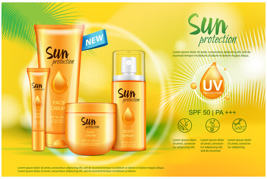 Sunscreen cosmetic set. Different SPF sunblock summer cosmetic: lotion, spray, cream. Anti UV protection, solar skincare products, healthy sunbathing concept.