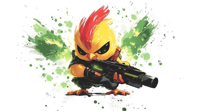 A cartoon chicken with a serious expression, wearing a military uniform, holding a large weapon, surrounded by green watercolor splatters.