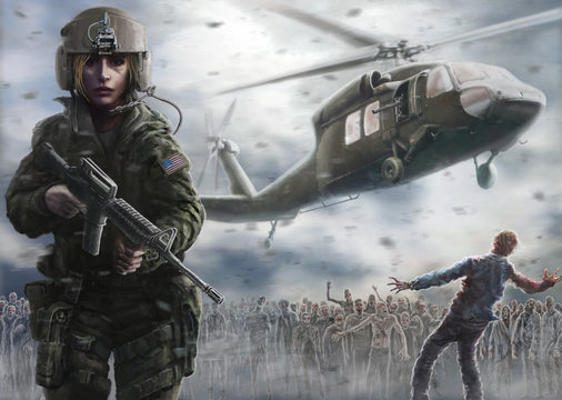 Woman pilot with an assault rifle. Zombie apocalypse zone.