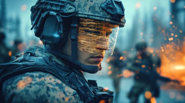 Futuristic soldier with augmented reality interface in combat situation