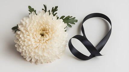 A white chrysanthemum flower accompanied by a black ribbon on a neutral background during a solemn occasion