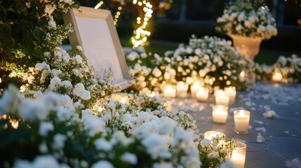 A solemn outdoor ceremony with a memorial, surrounded by fresh white flowers and candles