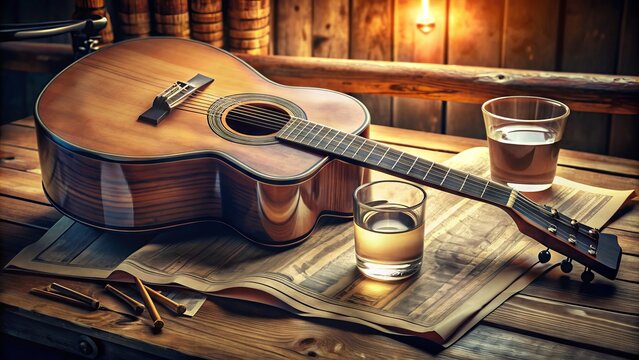 A vintage acoustic guitar lying on a wooden table, surrounded by music sheets and a glass of water, with a subtle warm lighting effect.