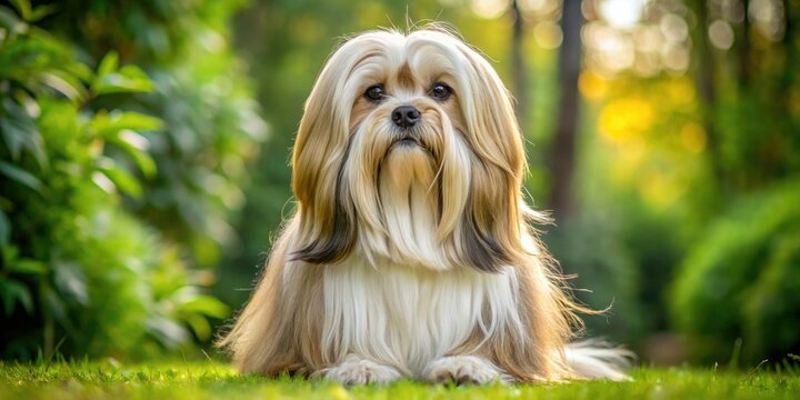 The Lhasa Apso's long locks flow like a golden river as it sits serenely, gazing up at the lens with gentle solicitude.