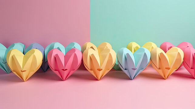 paper hearts in rainbow colors placed on a pastel background. Generative AI