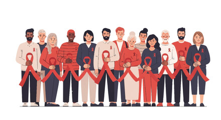 Diverse group of people standing together holding red ribbons on a white background with a supportive and awareness mood.