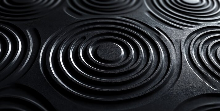 A black background with concentric circles of carved wood, representing the pattern and depth of sound waves in an audio system.