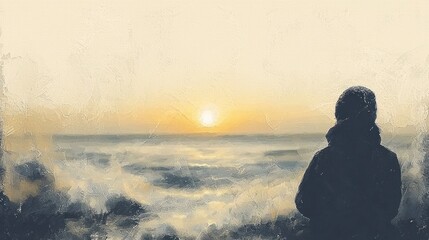A solitary figure, silhouetted against a breathtaking sunrise over a vast, misty ocean, contemplates the horizon while watching the waves gently crash on the shore, lost in