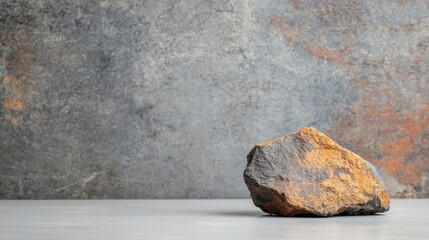 A solitary rock with varied textures and colors sits against a grey background, embodying the essence of minimalism and natural simplicity, highlighting the contrast between elements.