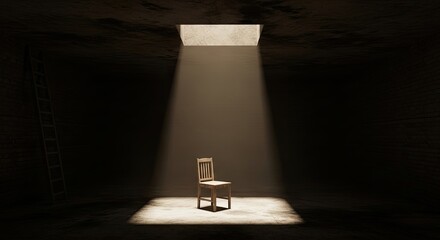 Red chair in solitary confinement cell, sunbeam through barred window, dust motes,  for film noir, mystery, or prison themes