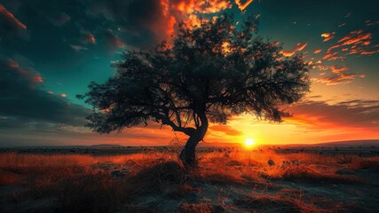 Video A solitary tree stands tall amidst a lush green grassy field during a breathtaking sunset