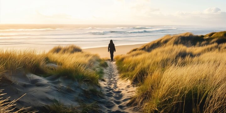 A tranquil scene capturing a person walking on a sandy path leading to a beach with the sun setting in the background