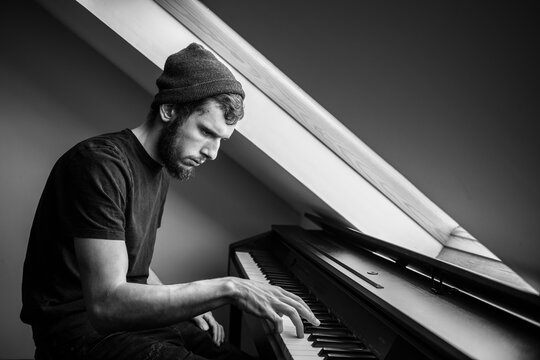Musician and composer in a hat plays piano, black and white, The pianist performs a musical work on the piano, man  bw photo