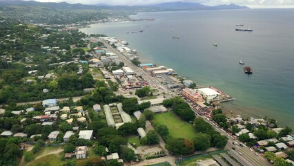 Aerial view in Honiara, looking from Woodford International School in the foreground and Point Cruz harbour in the background.