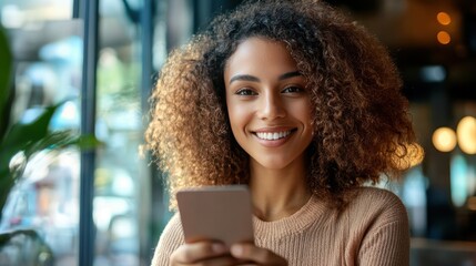 Customer holding smartphone with white screen near card payment terminal, surrounded by greenery, showcasing modern technology and payment solutions in a vibrant setting