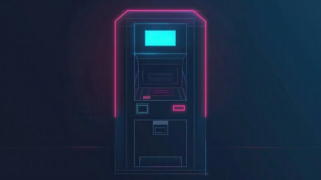 Futuristic minimalist line art of an ATM machine showcasing a sleek and secure interface for modern banking solutions
