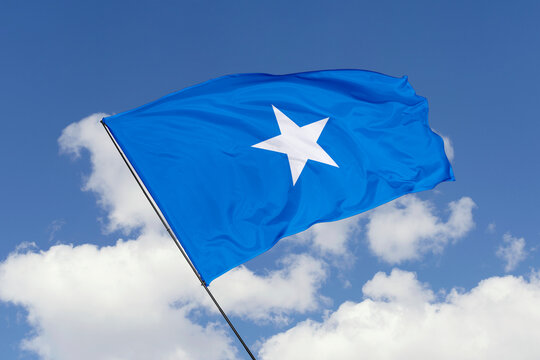 Somalia flag waving against clean blue sky, close up, isolated with clipping path mask alpha channel transparency
