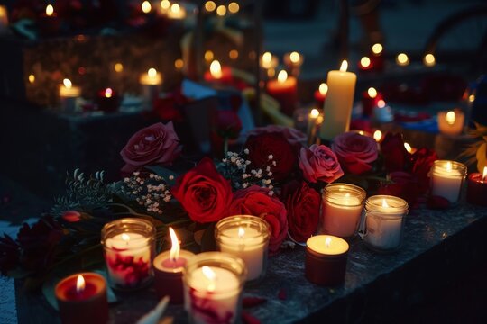 Candlelight vigil remembrance ceremony with glowing candles in darkness for peace and hope event