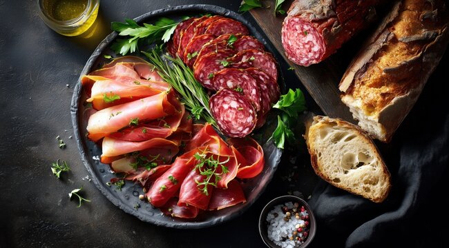 Une assiette de charcuterie avec du jambon, du saucisson, accompagné d'une baguette de pain coupée, arrière-plan sombre créant un contraste de couleurs avec la nourriture, vue de dessus.