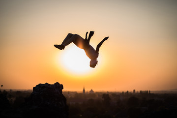 boy doing somersault on sunset background