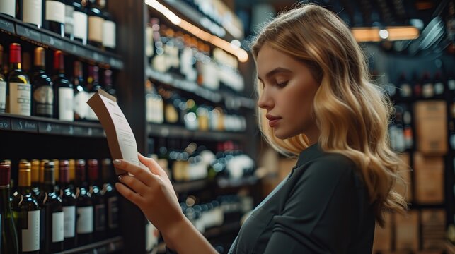 Professional caucasian woman sommelier checking wine quality and compare the data for taste. copy space for text.
