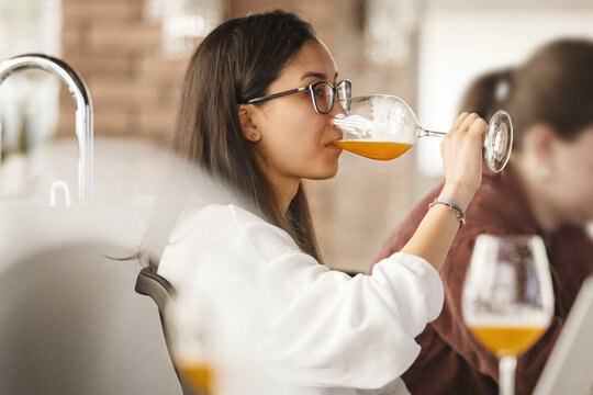 Wine waiter woman during blind tasting various alcoholic beverages. Sommelier exam to study different wine and beer.