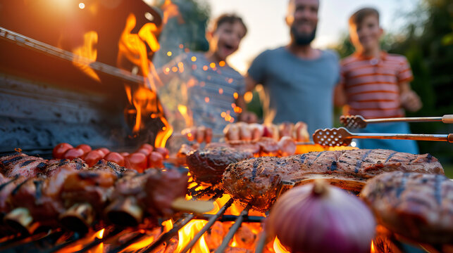 Summer BBQ Feast:  A sizzling barbecue grill with juicy steaks, chicken, and vegetables is a scene of summer happiness, with a dad and his two sons excitedly looking on.