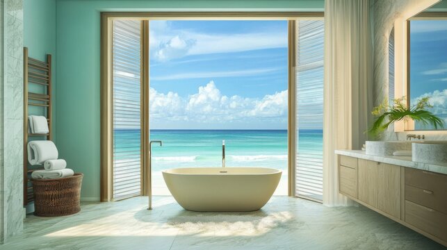A tranquil beach bathroom with a soft, soothing color palette,