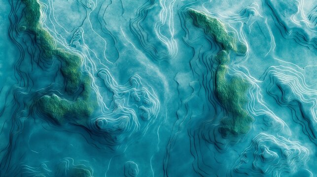 A calm, soothing texture of blues and greens with a topographical map design, suggesting oceanic depths and island topography from a bird's-eye view.