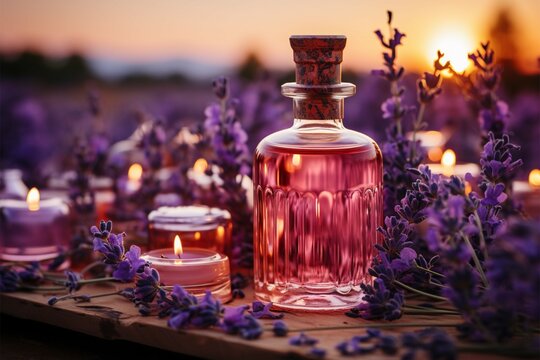 Aromatherapy heaven lavender panorama with essential oil flacons, soothing and aromatic Generative AI