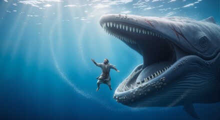 Dramatic underwater scene of prophet Jonah and the great fish with sharp teeth