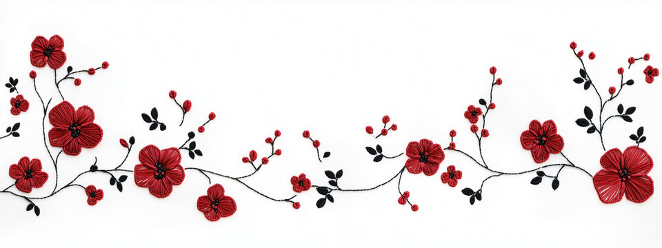 A delicate border embroidery design with fine red and black stitching of stylized vines and blossoms on a pristine white background