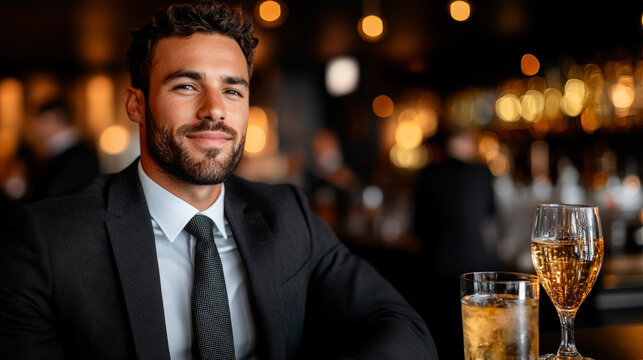Stylish business lounge bar with sophisticated lighting, premium spirits displayed, and professionals enjoying after-work drinks