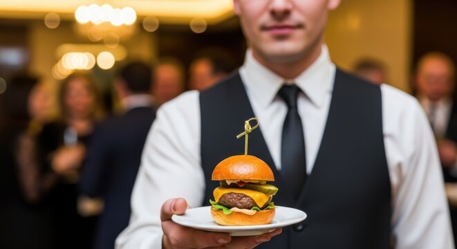 Elegant waiter presenting gourmet miniature burger at a sophisticated gathering ambience