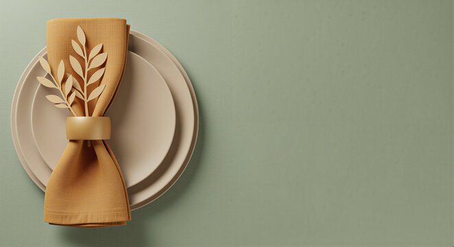 Elegant table setting with golden napkin and leaf decor for restaurant menu and festive dinner design