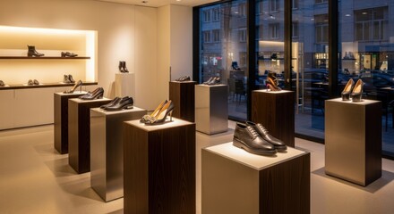 A modern shoe store interior displays various footwear on pedestals, illuminated by warm lighting.