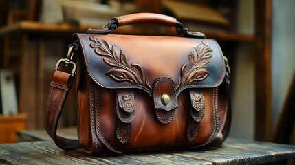 Brown leather briefcase with many sophisticated patterns