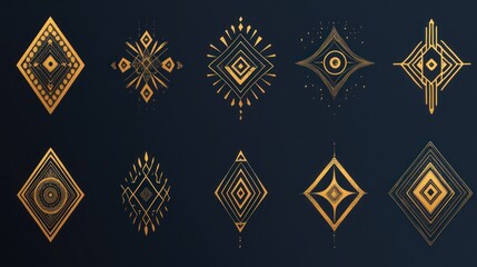Golden geometric patterns, design elements, dark background, graphic design resource