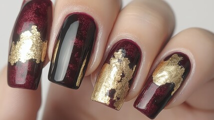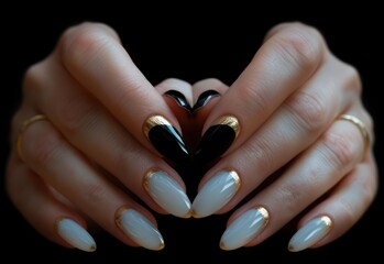 Black woman with bridal manicure featuring ivory and gold colors, showcasing perfect nails for weddings or luxury beauty services