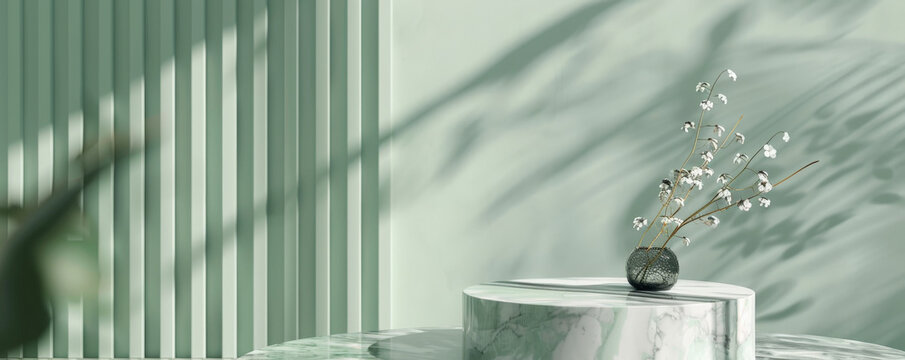 An elegant marble podium with silver veining, positioned in front of a pastel green wall. The soft and calming colors create a serene and sophisticated backdrop for showcasing products.