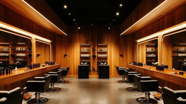 Modern, sophisticated salon interior with wooden accents.