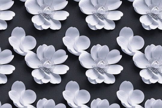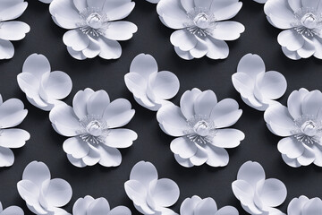 Refined seamless pattern minimalist camellias, silky white, matte black. Understated luxury design for stationery, high-end fabrics, sophisticated interiors