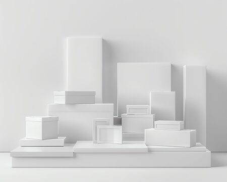 White packaging boxes of various sizes on luxurious display stand, white background, aura of beauty and sophistication
