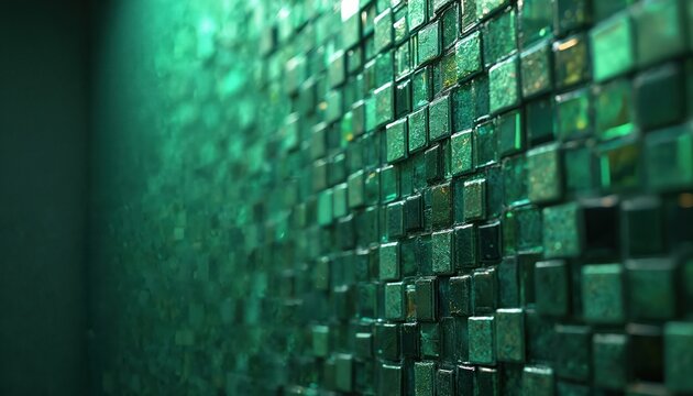 Abstract geometric shapes overlap, creating vibrant teal, green gradients. Modern design suggests depth, dimension, visual interest.