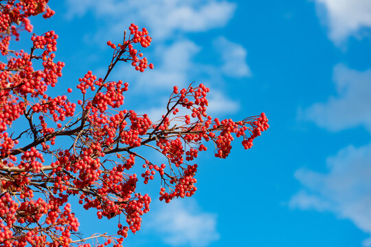 Frost-covered tree limbs with mature Rowan clusters on a cold winter afternoon.