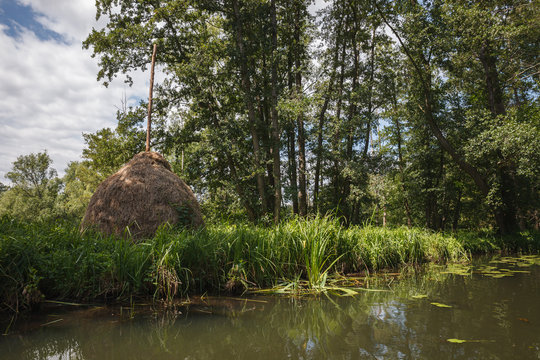 Low angle view of big rowan tree between gravel road and yellow rapeseed field, two other trees, forest, blue sky white and dark clouds at background. Dogberry tree at fieldside. Mountain ash at count