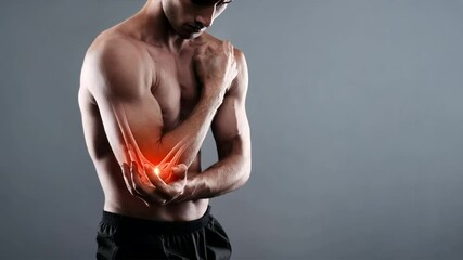 Man showing elbow pain in his arm, red glow highlights joint injury on grey background, showing discomfort from joint pain