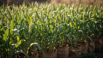Healthy sorghum in planter sacks under bright sunlight, representing green urban cultivation.