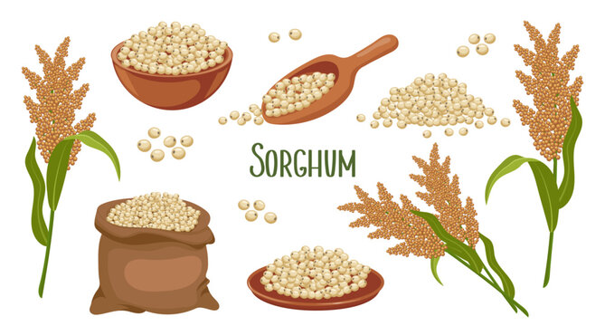 Set of sorghum grains and spikelets. Sorghum plant, sorghum grains in a plate, spatula and bag. Agriculture, design elements, vector